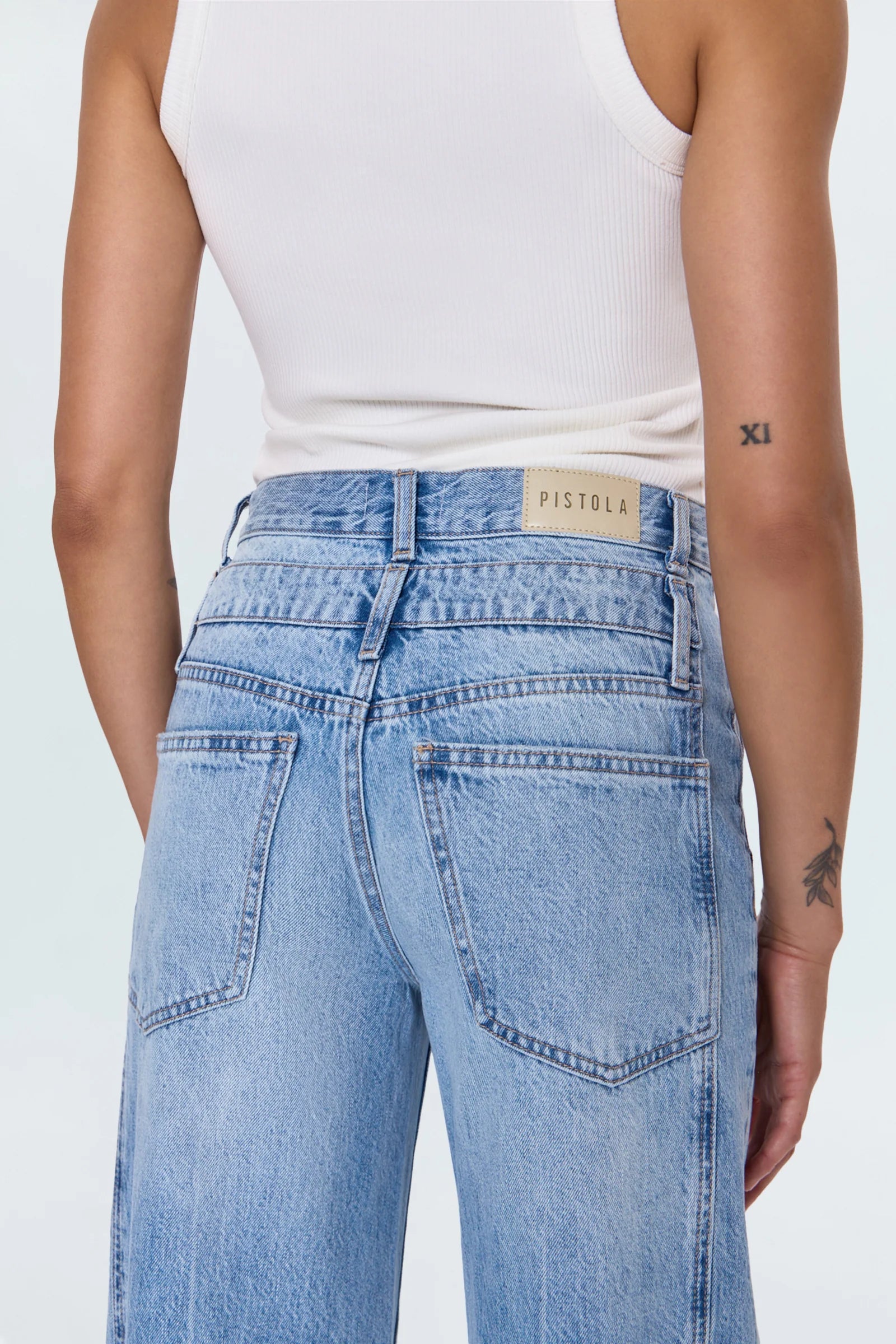 High rise denim with a relaxed, wide leg silhouette and full length hem. Defined by a double stacked waistband and elevated side seam details. Era is a light blue denim wash with clean finishes and free of fading or distressing.