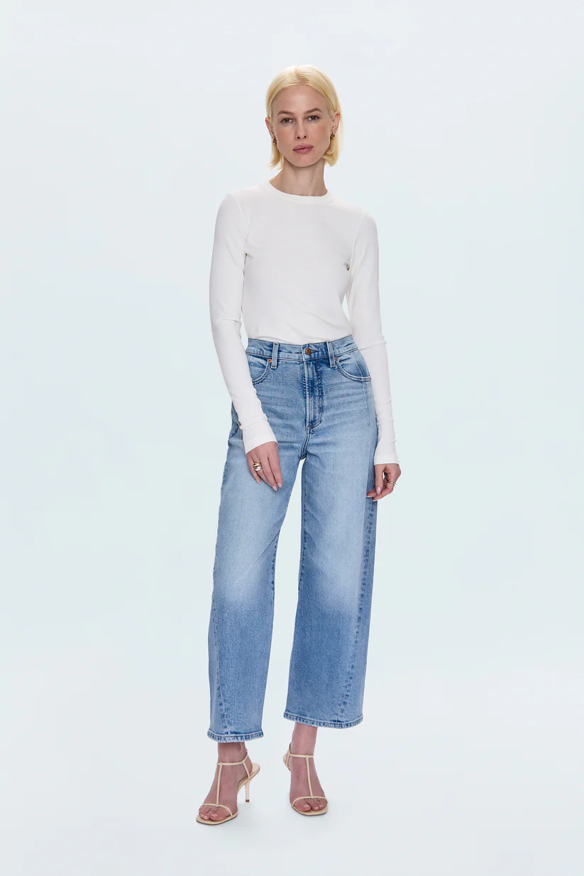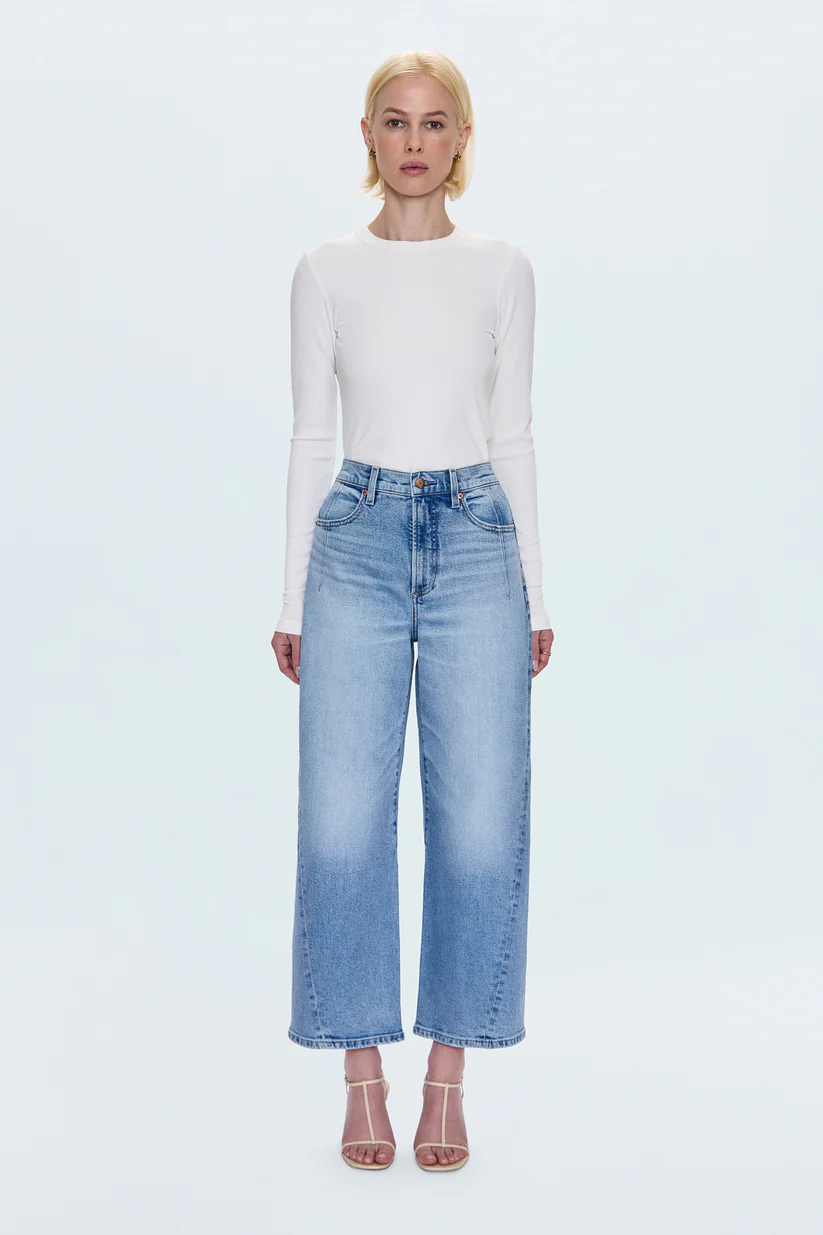 The new must-have jean with a twist. Kyra sits confidently at a high rise with our signature bowed leg silhouette and cropped 28" inseam. The subtle curve creates dimension while the wide ankle opening adds modern proportion with a new wide angle for the season. Fashion detail seaming, including a twisted seam that moves forward and yoke seams in the back, brings modern denim classic sophistication. Crafted from our signature comfort stretch denim in Terrace, a light vintage inspired wash with subtle fading that feels both contemporary and timeless.