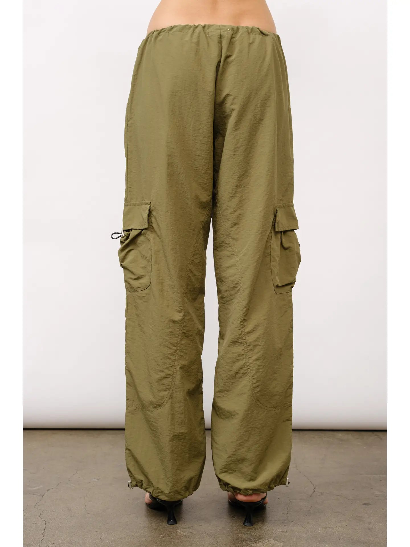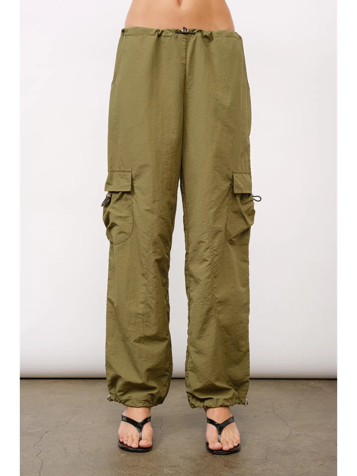 Parachute cargo pants with adjustable bands at waist, hem, and cargo pockets. Available in 2 colors. Comfortable and cool, these lightweight pants are perfect for back-to-school. Dress it up with a sleek top or down with a vintage graphic tee.