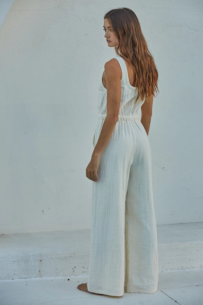 Woven Cotton Scoop Neck Sleeveless Wide Leg Jumpsuit With Waist Tie Rope String And Front Pockets.