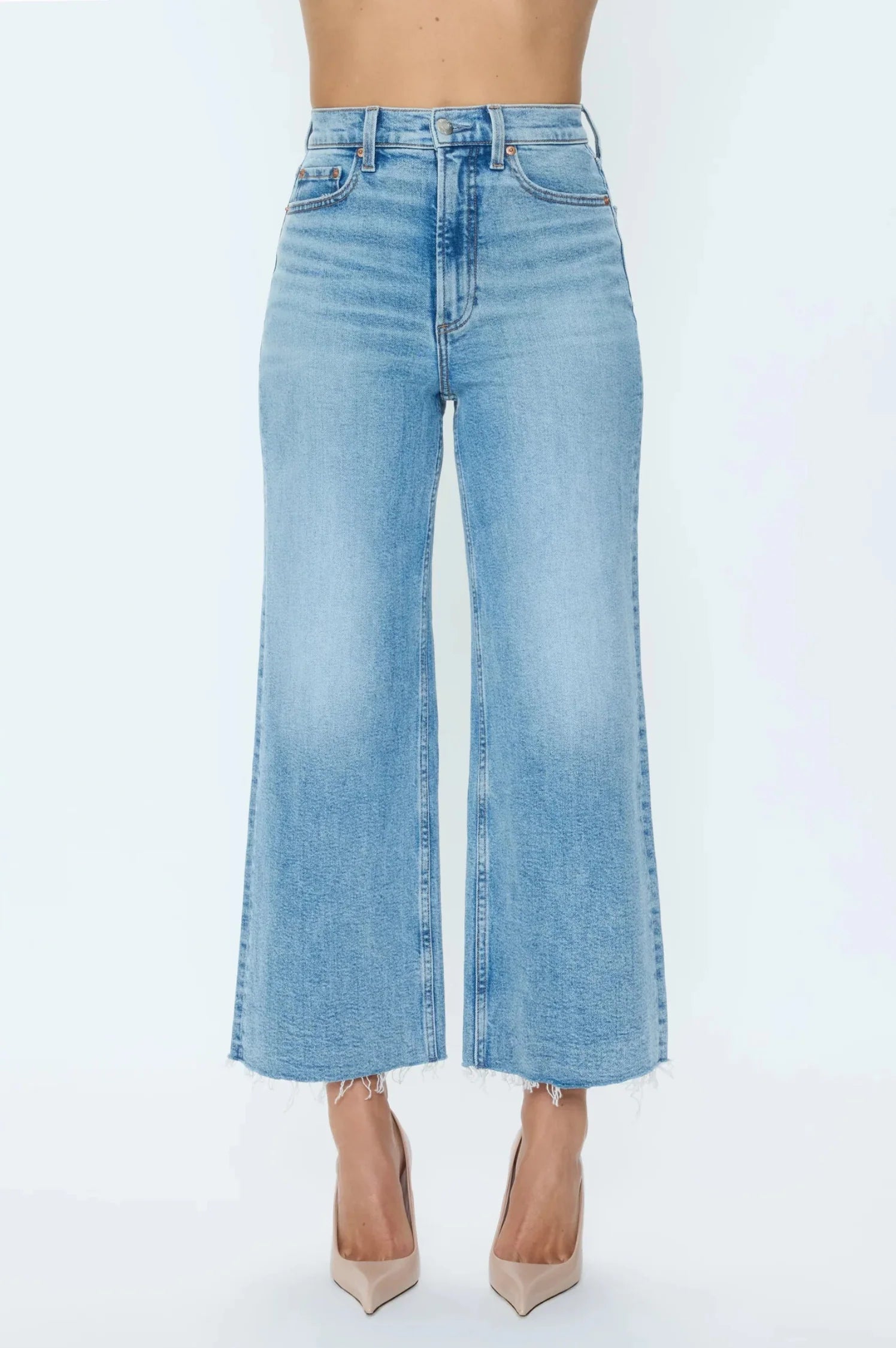 - Lana Crop High Rise Ultra Wide Leg delivers commanding presence with a high rise and ultra wide leg silhouette, finished with a full-length 33" inseam. The double button closure adds modern detail while the ultra wide opening brings contemporary proportions to any look. Crafted from our comfort stretch denim that provides structured shape with the perfect amount of movement. Terrace brings effortless sophistication with its light wash and subtle fading that feels authentically lived-in.