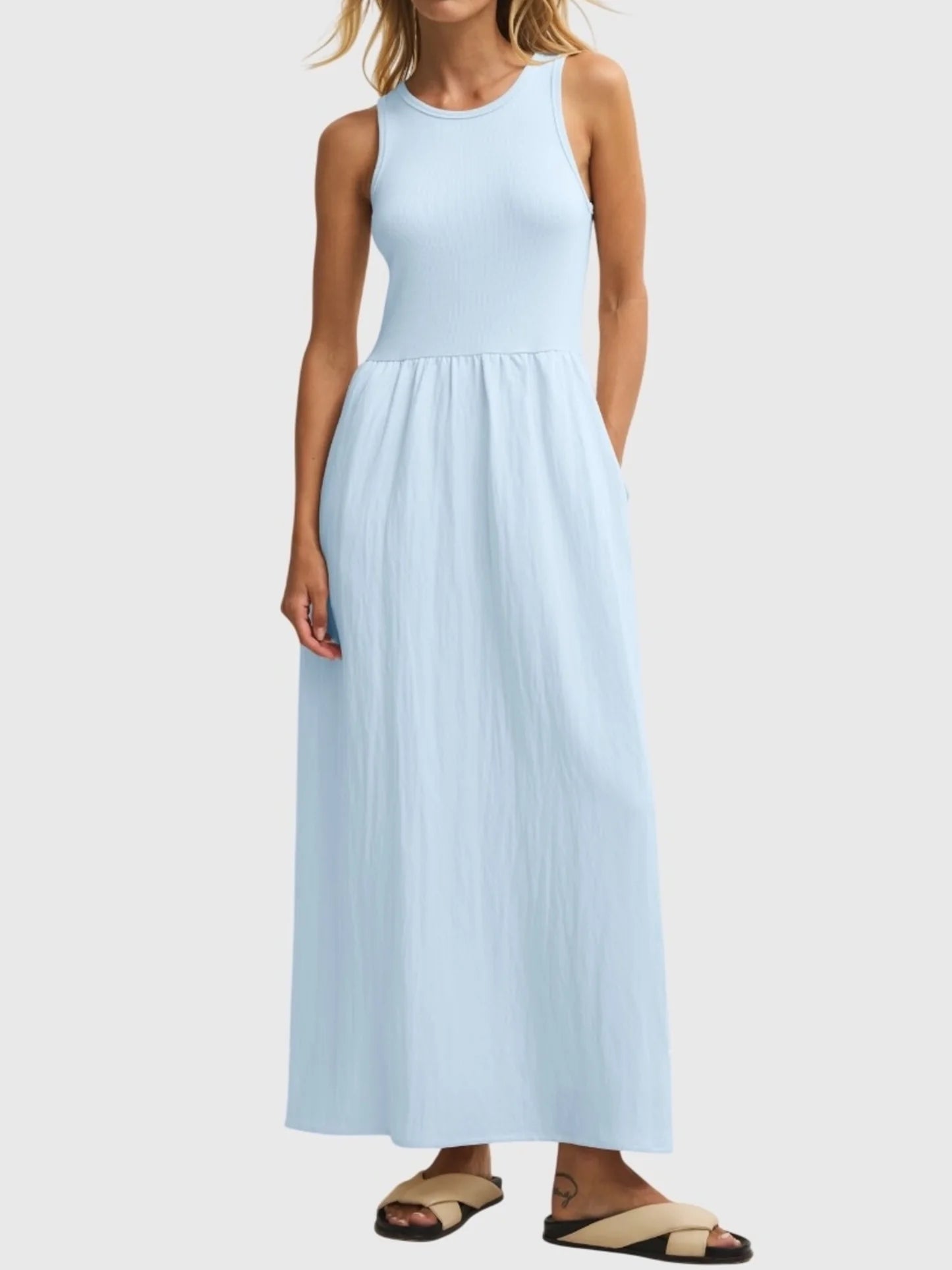 The soft ribbed bodice flatters with a fitted shape, while the lined textured rayon skirt flows down to hit above your ankles. Finished with a high neckline, sleeveless silhouette, and hidden pockets, it’s an elevated everyday dress you can wear all season.